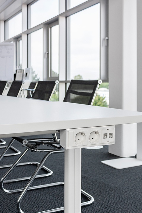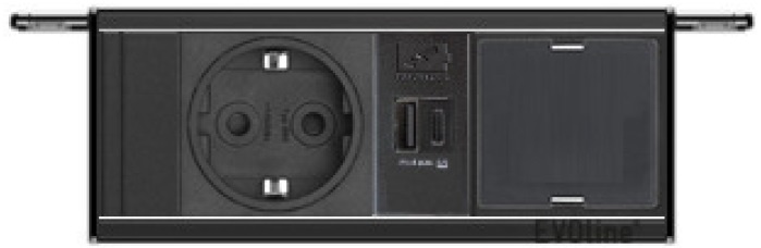 EVOline DockFIX PowerMedia MINI - Aluminium schwarz eloxiert, Stahlseitendeckel schwarz, 1 x VDE-Steckdose sw 0°, 16A, 1 x USB-Charger sw Typ A+C 18W, 1 x freier Wechselmodulplatz (50mm), 1m Kabel und GST18-Stecker inkl. Verriegelung, Länge inkl. Winkel: 191mm, Länge exkl. Winkel: 149mm
