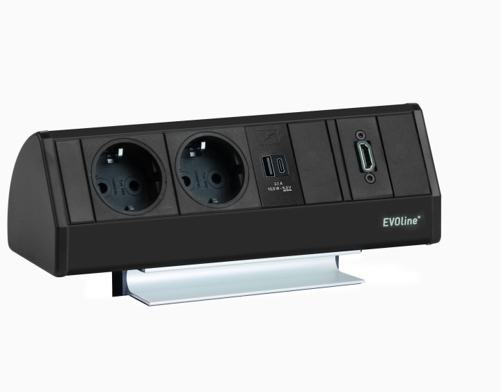 DockFLEX PowerMedia - Aluminium schwarz eloxiert, 2 x VDE-Steckdose 0°, 16A 1 x USB-Charger A+C 18W, 1 x HDMI 2.0 mit 0,2m Kabel und Buchse, 1 x leere Modulplatte 25mm (Reserve), 0,4m Kabel mit GST-Stecker, 1 x QuickLock Tischklemme 18-32m mit Aluminiumblende schwarz eloxiert und Rändelschraube, Länge 209mm