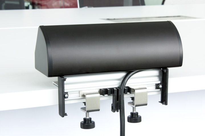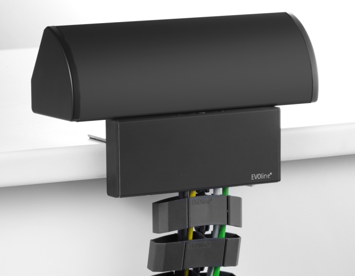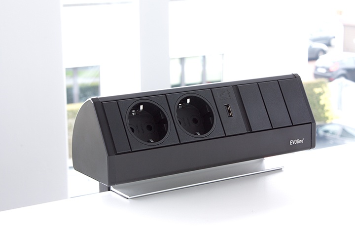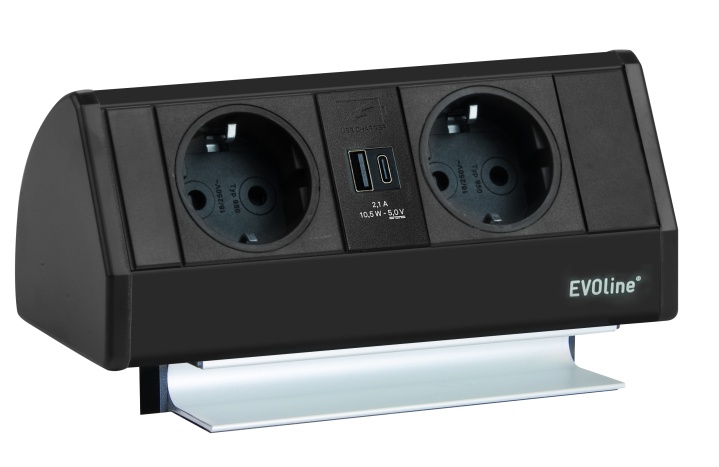 DockFLEX PowerUSB - Aluminium schwarz eloxiert, Kunststoffseitendeckel schwarz, 2 x VDE-Steckdose 0°, 16A, 1 x USB-Charger Typ A+C 18W, 0,4m Kabel und GST18-Stecker, 1 x QuickLock Tischklemme 18-32m mit Aluminiumblende schwarz eloxiert und Rändelschraube, Länge 169mm