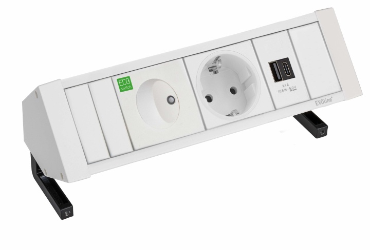 EVOline DockSquare ECOswitch MINI klemmen - Aluminium weiß gepulvert, Kunststoffseitendeckel weiß, 1 x Schalter 16A,LED grün, schaltet Dock + Ausgangskabel weiß, 1 x VDE-Steckdose 0° ws, 16A, 1 x USB-Charger ws Typ A+C 18W, Eingangskabel 1m weiß und GST18-Stecker inkl. Verriegelung, Ausgangskabel 1m weiß und GST18-Buchse, Inkl. Integralklemme 8 – 40mm Spannweite, Länge 210mm