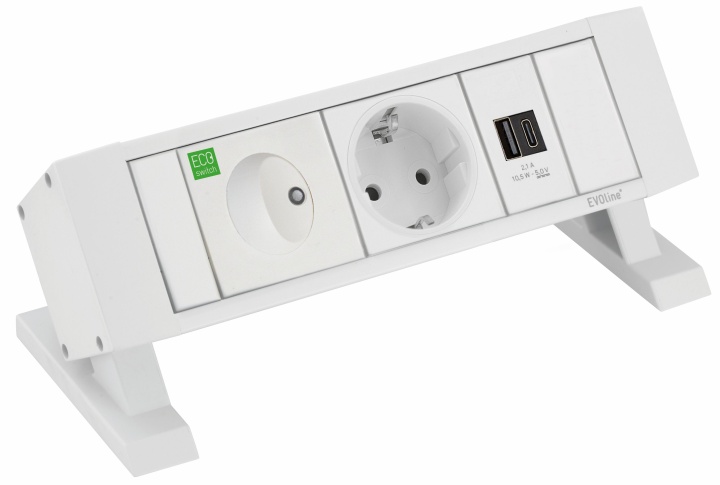 EVOline DockSquare ECOswitch MINI klemmen - Aluminium weiß gepulvert, Kunststoffseitendeckel weiß, 1 x Schalter 16A, LED grün, schaltet den Dock, 1 x VDE-Steckdose ws, 0°, 16A, 1 x USB-Charger ws, Typ A+C 18W, Eingangskabel 1m und GST18-Stecker inkl. Verriegelung weiß, Ausgangskabel 1m und GST18-Buchse weiß, Inkl. vormontierter Klebestreifen, Länge 184mm