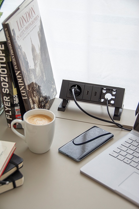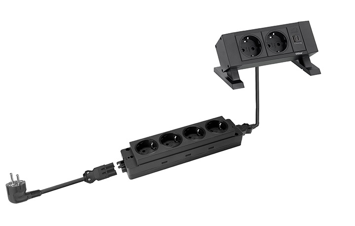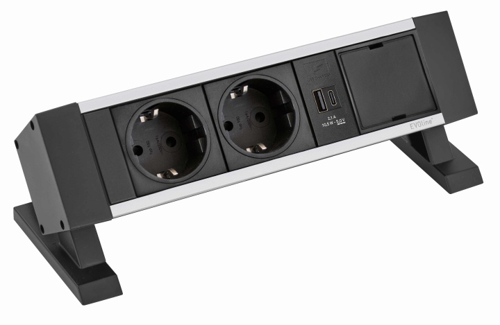 EVOline DockSquare PowerMedia kleben - Aluminium silber eloxiert, Kunststoffseitendeckel schwarz, 2 x VDE-Steckdose, 0°, 16A, 1 x USB-Doppelcharger Typ A+C 18W, 1 x freier Wechselmodulplatz (50mm), 1m Kabel und GST18-Stecker, Inkl. vormontierter Klebestreifen, Länge 219mm