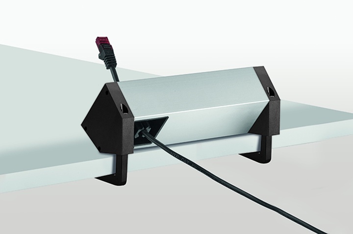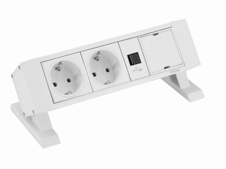 EVOline DockSquare PowerMedia kleben - Aluminium weiß gepulvert (ähnlich RAL 9010), Kunststoffseitendeckel weiß, 2 x VDE-Steckdose ws, 0°, 16A, 1 x USB-Charger ws, Typ A+C 18W, 1x freier Wechselmodulplatz (50mm) ws, 1m Kabel und GST18-Stecker sw, Inkl. vormontierter Klebestreifen, Länge 219mm