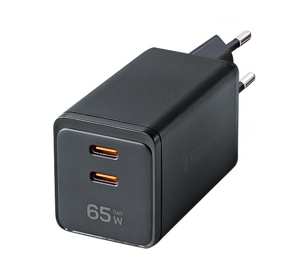 EVOline Netzteil 65W CC - USB Netzteil mit Typ C+C, 65W Ausgang: USB-C PD 3.0 / QC 3.0 /PPS 5 V / 3 A (15 W) 9 V / 3 A (27 W) 12 V / 3 A (36 W) 15 V / 3 A (45 W) 20 V / 3,25 A (65 W) USB-C Power Delivery Output bei Verwendung beider Anschlüsse: 45 W + 20 W oder 65 W Abmessungen: 93 x 32 x 36 mm, schwarz