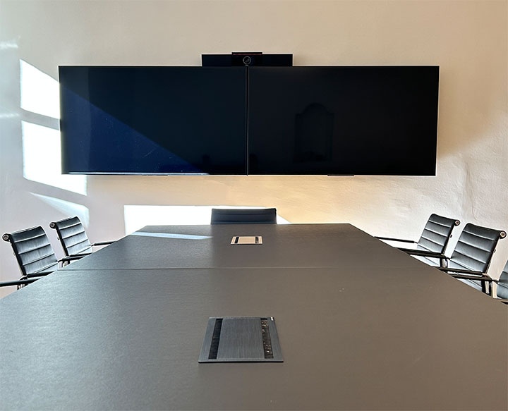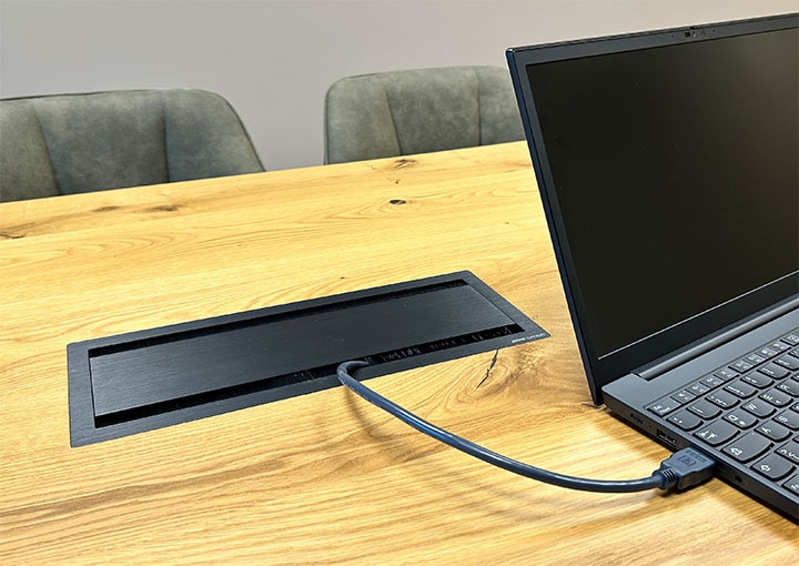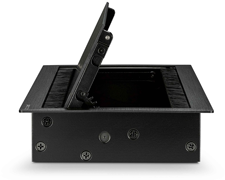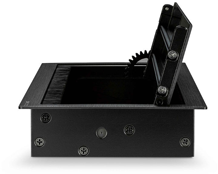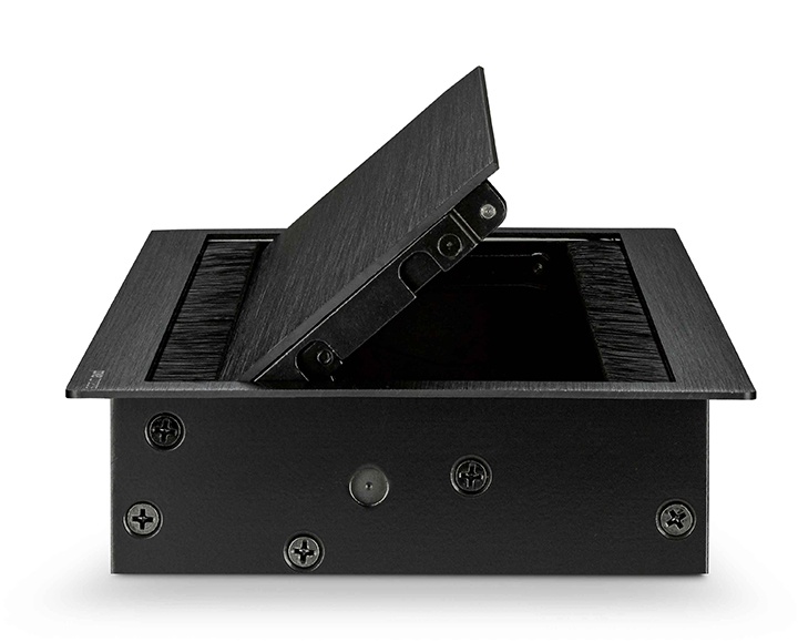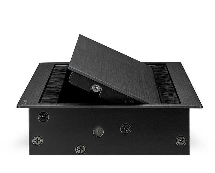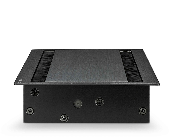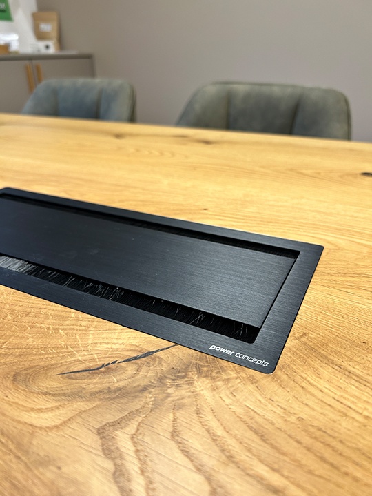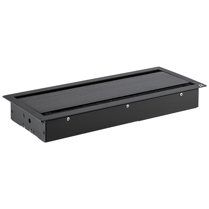 TWIN COVER M350 - Tischanschlussfeld mit beidseitig öffnendem Soft-Close Flipdeckel und Bürstendurchlass, Oberfläche Aluminium gebürstet schwarz eloxiert, ohne Kabelwanne, Außenabmessungen: L350 x B150 x H42mm, Radius R3mm Ausschnittsmaße: L335 x B135mm, by power concepts